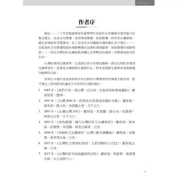 這8本與台灣環境有關的專書,每一本書都有具體的研究計畫做為研究發表的資料基礎,可說是一個計畫完成一本書。本書的兩位作者,許耿銘和林宗弘則分別從上述第6 本(2015 年)和第8 本(2019 年)開始參與蕭新煌主持的研究、寫作和出版。