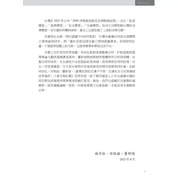 台灣於2022年公布「2050淨零排放路徑及策略總說明」,並以「能源轉型」、「產業轉型」、「生活轉型」、「社會轉型」為四大目標推動台灣的淨零轉型,本書的架構與章節,基本上也都對應了上述的淨零目標。