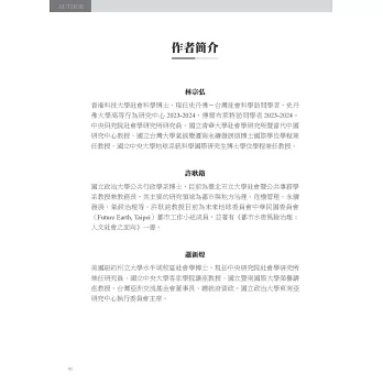 這些課題構成了本書對台灣減碳政策民意基礎的剖析,更在結論提出我們對台灣邁向淨零社會的政策建議。