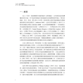 近三十年來,氣候變遷受到越來越多人群的關注,全球排放溫室氣體導致地球升溫,有可能使得極端天氣現象發生的規模與頻率增加,特別是風暴、洪水、熱浪、野火與土石流等,對海岸與山坡地等高風險或生態敏感地區的危害程度提升(Anderson 2000),也對世界各國與人口集中之大城市的風險治理能力造成重大衝擊。在全球氣候變遷影響下,有些區域比其他區域面臨更高的危害度,台灣是其中之一。世界銀行的天然災害熱點:全球風險分析(Natural Disaster Hotspots: A Global Risk Analysis)報告指出,台灣有73% 的土地面積暴露於三種以上天然災害風險之中,面臨三種以上災害威脅的人口也將近73% ,是全球易受到天然災害威脅的地區之一(Dilley et al. 2005),近年來莫拉克颱風(2009)、珊迪颶風(2012)與2021 年的旱災與2023 年的高溫等,相繼造成嚴重的人員傷亡或經濟損失,台灣民眾對氣候變遷與減碳政策的關注程度也逐漸提升。