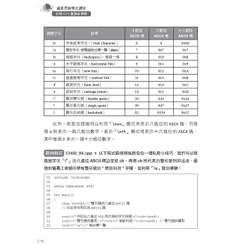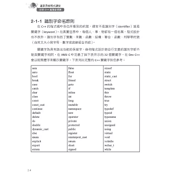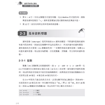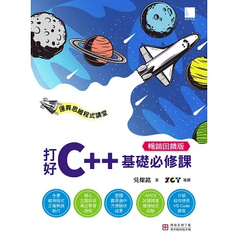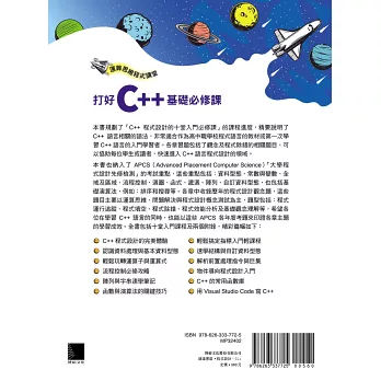 本書也納入了APCS(Advanced Placement Computer Science)「大學程式設計先修檢測」的考試重點,這些重點包括:資料型態、常數與變數、全域及區域、流程控制、迴圈、函式、遞迴、陣列、自訂資料型態,也包括基礎演算法,例如:排序和搜尋等。各章中收錄歷年的程式設計觀念題,這些題目主要以運算思維、問題解決與程式設計概念測試為主,題型包括:程式運行追蹤、程式填空、程式除錯、程式效能分析及基礎觀念理解等,希望各位在學習C++語言的同時,也能以這些APCS各年度考題來印證各章主題的學習成效。全書包括十堂入門課程及兩個附錄,精彩篇幅如下: