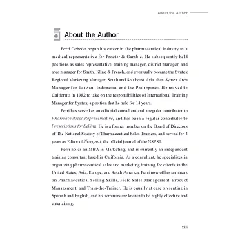 Perri Cebedo的職業生涯始於製藥公司基層業務代表,最終成為Syntex亞太區總經理。1982年,他移居加州,擔任Syntex國際培訓經理,並在該職位上擔任了14年。Perri目前是加州的獨立培訓顧問。作為顧問,他專門為美國、歐洲、亞洲、和中南美洲的客戶組織藥品銷售和行銷培訓,提供有關藥品銷售技巧、現場銷售管理、產品管理和培訓師培訓的研討會。