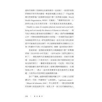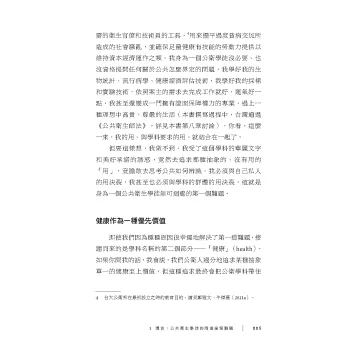 ○○○可以帶入健康人權、群體健康、國家/民族健康、「全民健康覆蓋」(universal health coverage, UHC)、全民健康(Health for All)、星球健康(planetary health)、健康一體(One Health),或者其他更多的美好群體生活想像。這些巨大的主張,都是極具規範性的倫理主張,換言之,這些主張都是在說,「我們」基於某些「倫理理由」,應該要去追求某些「應該追求的東西」。我並不是在說,我懷疑以上主張的根本倫理價值,或是質疑立法的政治正當性(雖然有些時候它們的確相當可疑),不消說,健康當然是個好東西,多多益善。但我還是忍不住好奇,撇開條文本身不管(法畢竟是人立的),所以,這裡說的「我們」是誰?基於哪些「倫理理由」?該去追求什麼「應該追求的東西」?這些東西是該由誰來負擔的集體責任、來聲索的權利、或實踐的倫理義務?健康在這些東西之中,總是最重要、最優先的價值嗎?這些問題使公衛學徒深深困惑。本書的目的,就是要嘗試回答這些根本問題。