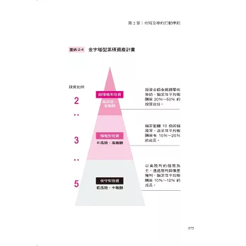 其中讓我印象最深刻的,便是金字塔型累積資產計畫,作者用不同程度的風險與報酬,堆疊出金字塔型的投資組合,讓讀者用不同風險等級區分投資部位,建立自己的策略。