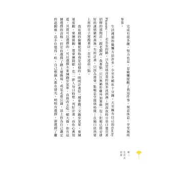 此書是由生活提煉的智慧之書。其中最要緊的提醒,是活在當下。當下是一份真正的禮物,英文裡說in the present ,說久了都忘記此present 其實也是彼present。人人都有這份禮物,如何體驗當下則看個人怎麼打開這份禮物。心有富足的人巧手生花,連撲通摔在爛泥裡也抓住一個哈哈大笑的機會。人真正的居所是他的意識狀態,因心思意念會給人絕大的動能,創造天堂,或者創造地獄。采岑這書之好,不只好在她讓讀者參與她的天堂——好吃的,好看的,可愛的,獸,或人,或宇宙——也好在她坦白承認,生活往往是前往天堂的路上。──許菁芳/作家