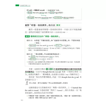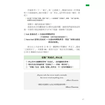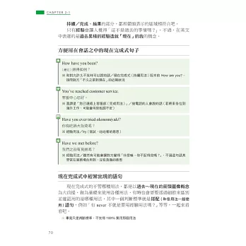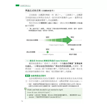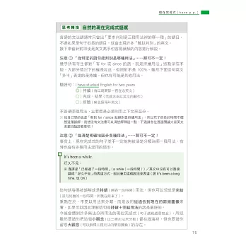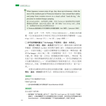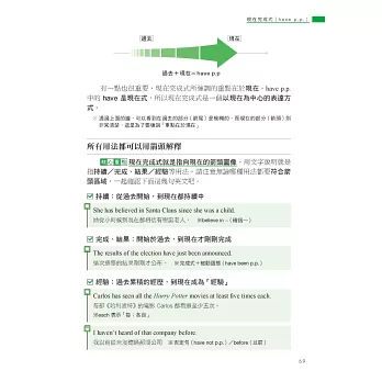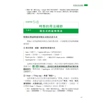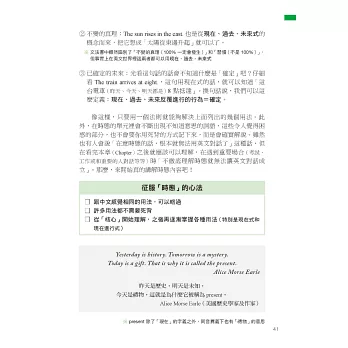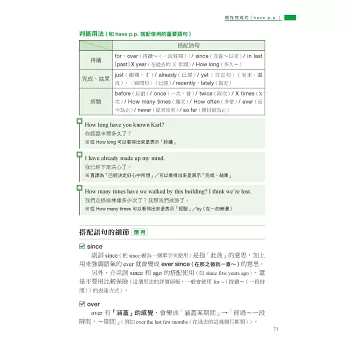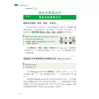 因此本書透過生活化的情境設定,如 I’m cooking dinner.(我正在煮晚餐)說明進行式所表達的其實是「在做~的過程中」,讓你體會到重點在於「過程」,而不是「正在進行」,再利用生活中真的會用到的例句,如用來回答店員的 We’re still deciding.(我們還在看)或和朋友閒話家常時會說的 I’m reading a one-thousand page novel.(我正在看一本 1000 頁的小說)、He’s always complaining about poor service at restaurants.(他總是在抱怨餐廳的服務不好),來告訴你進行式不只「正在進行」,還可以表達「非當下瞬間」和「強調反覆」,不只瞬間讓你理解進行式的重要觀念,還讓你知道下次可以用在哪裡,唯有將文法觀念與實際運用相結合,讓你知道該怎麼用、可以用在哪裡,才能真正學會!