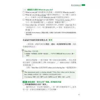 一般文法書在講解「進行式」這個重要文法時,只會跟你說的意思就是「正在進行」,再把進行式的句型變化規則列出來,再搭配幾個套用句型的句子。上面提到的這些,本書也都有,但是想要真的學會並自然運用進行式,只有這樣是不夠的!