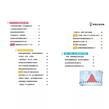 本書以國高中會學到的統計知識為主,帶讀者掌握基本概念,並輔以生活實際案例,例如「從發票存根得知顧客的喜好」、「平均每位臺灣人擁有的淨金融資產約483萬元」、「市調抽樣檢查計算」等等,幫助理解好學習。無論是學生、家長或教學工作者,都可參照書底的「十二年國教課綱對照表」,精準有效率地預習或複習。