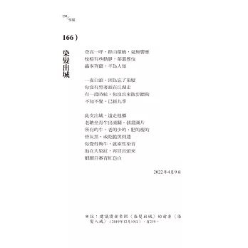 可能以後不再寫詩,九部詩集出齊,心願已了,可能轉軚寫現代散文。這部《髣髴》倒不能不交代一些細節。它的確是2018年出版的《傾斜》、《教授等雨停》與2021年印行的《衣冠南渡》再加上2022年幾十首近作的「選輯」。