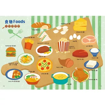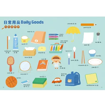 本書共有33個生活化的單元,整理了超過600個生活中的中文常用字和英文單字,更集合中文、英文、台語和客語四種不同語言之發音,每個單元還有互動遊戲。