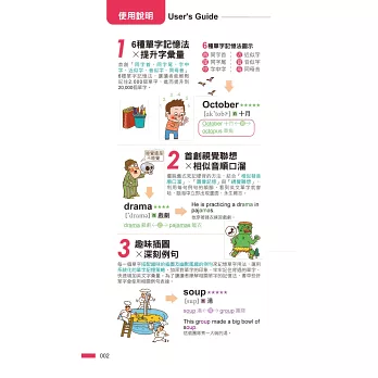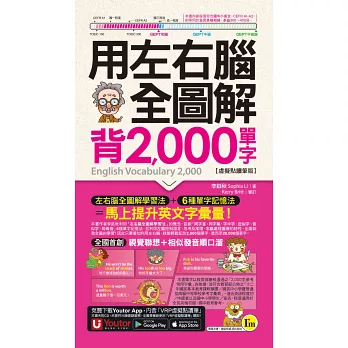 本書每一頁特別以「左方以圖像呈現」、「右方以文字呈現」的方式設計,完全結合人類左腦掌管語言區、右腦具有圖像化機能的特性,並運用左右腦不同的學習方式及系統化的單字記憶策略,加深學習印象。本書以2000張完全依例句內容所繪製的「情境式插圖」來記憶單字字義!