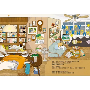 1. 故事畫面充滿生活痕跡及細節的插圖,並且以家人煮食聚餐的溫暖畫面,讓親子感受到家是眾人生活且彼此相依的重要場景。