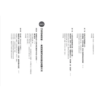 4.輔以大量真實故事案例,傳達10倍成長思維的概念:作者為本書架構提供具體的實例,讀者能夠透過他人擁抱10倍成長思維的過程來學習與借鏡。