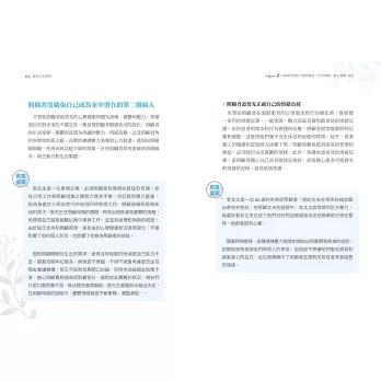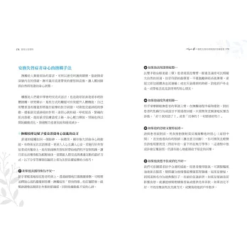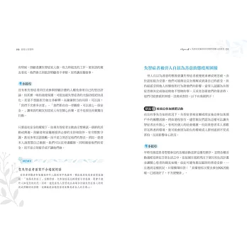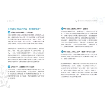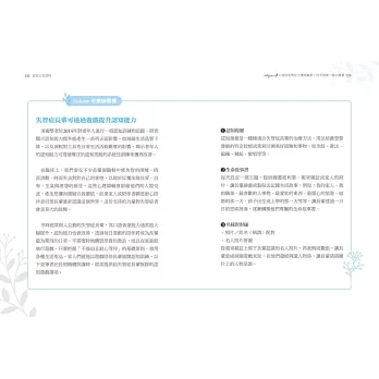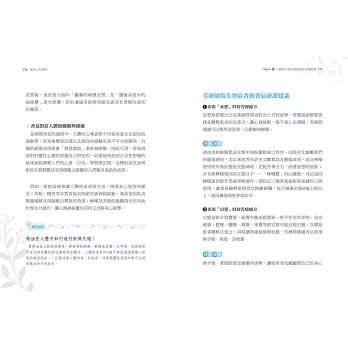 「本書是我們面對失智症與了解疾病預防的福音之書,越勇於認識失智症,我們就越能從中獲取相關能力及知識。尤其本書兩位作者是失智照護研究的專家,所給予讀者的知識與資訊,涵蓋了身心靈全面照護的經驗及建議,絕對是一本全年齡層都適合閱讀的健康好書。」──璞成心遇空間心理諮商所所長/蘇絢慧