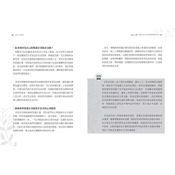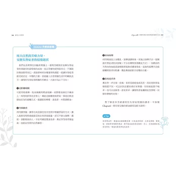 失智症的主要照顧者為了照料家人,常得犧牲原有的生活方式和時間,對於工作、社交、心理狀態皆有重大影響。然而,照護者的情緒往往被忽略,而出現憂鬱、焦慮、失眠狀況。書中收錄建立「家庭及社會支援網」的方法和資源,讓照護者有方法地尋求協助,再透過芳療師的生活建議,讓身體疲勞、睡眠、壓力獲得緩解,有了出口及喘息機會,照護生活才不會壓垮整個家庭,更避免照顧者成為潛在的第二個病人。