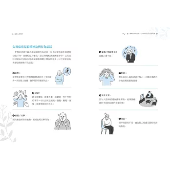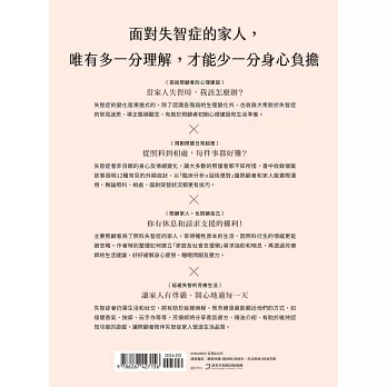 失智症與腦部神經細胞變化有關,屬於進行性退化的疾病,會影響記憶、思考、行為、日常能力等等。失智症的變化是漸進式的,包含輕度認知障礙期、輕度失智症期、中度失智症期、重度失智症期的表現不盡相同,作者除了認識各階段的生理變化,也收錄大眾對於失智症的常見迷思、導正錯誤觀念,有助於照顧者初期心理建設和生活準備。