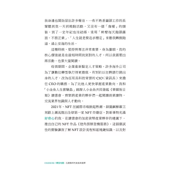2021年,NFT在國際市場掀起熱潮,師園鹹酥雞立刻跟上潮流推出全球第一家NFT炸雞店。對新事物充滿好奇心的我,在讀書會的加密貨幣產業夥伴的建議下,推出自己的NFT作品《挖角預辦登機服務》。這個嘗試性的實驗讓我了解NFT設計流程和區塊鏈知識,以及對獵才市場的影響。透過不斷學習、持續試驗,我建立起成長型思維,也適應了變動的步調。