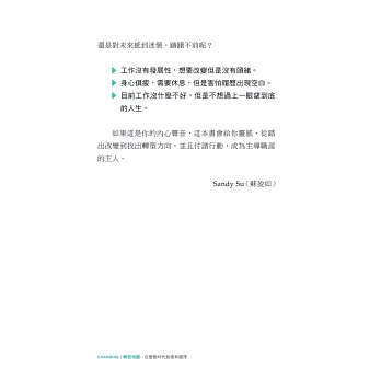 如果這是你的內心聲音,這本書會給你靈感,從踏出改變到找出轉型方向,並且付諸行動,成為主導職涯的主人。