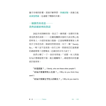 2022年疫情解封後,我去了一趟英國,在鄉村市集看見熟悉的身影 ─── 我一位擺地攤賣衣服的大叔正熱心地招呼客人,介紹印度進口服飾。正當他彎腰著幫客人尋找尺寸和花色時,眼神突然對到我,叫了一聲「Sandy Su」。咦?這不是我第一份打工時,那個兇巴巴逼業績的總經理嗎?怎麼變成一位親切的中年大叔了!