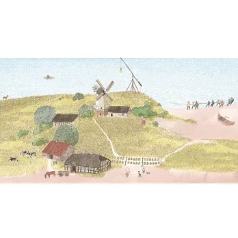 安野光雅曾在訪談中提到,《旅之繪本》的靈感來自於一次飛機即將降落的時刻,從空中已經可以看到住家的屋頂,雖然是文化完全不同的異國,但一樣有熱鬧的市場,有人在種田,有教會跟銀行,讓他興起了想用這個視角描繪人們生活的念頭。在《瑞士篇》中,為了描繪壯闊的阿爾卑斯山脈,可以發現視角與以往有些不同,小烏利也現身在畫中敲著門尋找鈴鐺。而根據未公開畫稿完成的《荷蘭篇》,有許多安野鍾愛的畫家,視角也更自由寫意,最後旅人在畫面上方還回了馬,這趟從1977年啟程的班機也彷彿伴隨著低垂的晚霞緩緩降落,留下對旅人悠遠綿長的思念。――謝依玲(作家、譯者)