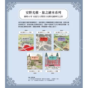 若你喜歡《旅之繪本》,不要錯過精彩的第6到10輯,安野光雅帶讀者穿過安徒生的丹麥(書裡居然藏了60個安徒生童話故事)、瑞士知名畫家筆下的風景,也帶我們到達亞洲,進入清明上河圖的中國,和他記憶中的祖國日本,並納入了他最後一本遺作荷蘭,本本值得細細品味和收藏!――周婉湘(《一起讀、一起玩》作者和粉專版主」)