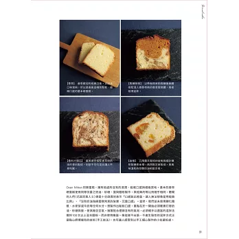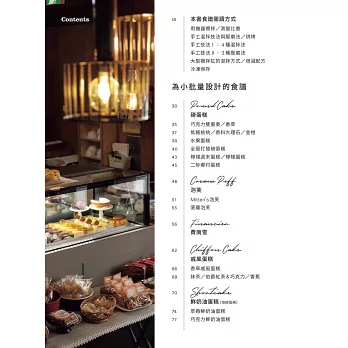 書中食譜主要以使用桌上型攪拌機來製作的營業用配方,但也有提示份量較少的家庭用比例,商業經營和家用都適宜。食譜解說詳盡、步驟清楚,務求每個人做出來的點心,都能跟專賣店一樣好吃。想要精進烘焙技術的人,請一起研讀、製作,並開心地享用成果吧!