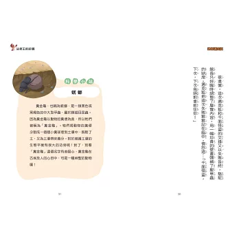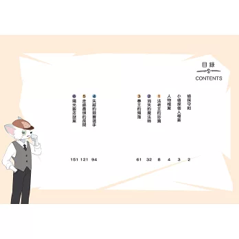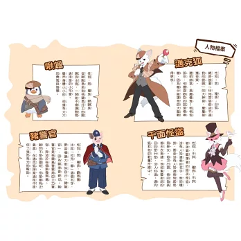 ✦科學小站:每個案件背後都隱藏著科學原理和科普知識,包含物理、化學、生物等六大學科知識。本書的科普小知識:沙漠之舟駱駝、傳說中的糞金龜、驚人的負鼠、要小心箭毒蛙、犀牛與犀牛鳥、可愛的海獺、強韌的蜘蛛絲。