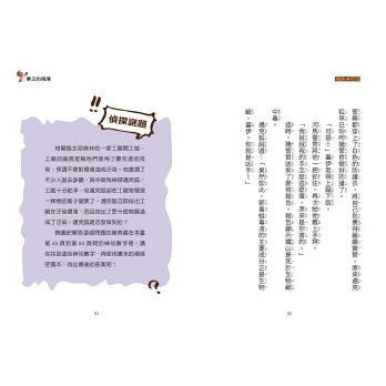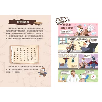 ✦「偵探謎題」與「偵探密碼本」:邀請小偵探們一起來挑戰終極密碼,答案就藏在本書的神祕數字裡,請找到數字,再使用書末的偵探密碼本,就可以解出謎題。