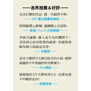 ◎ 謀殺版的《今天暫時停止》……讓人怎麼也猜不中劇情走向,塑造人物、構畫情節的高明技藝,是這故事註定成功的核心。──《金融時報》
