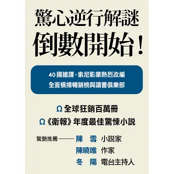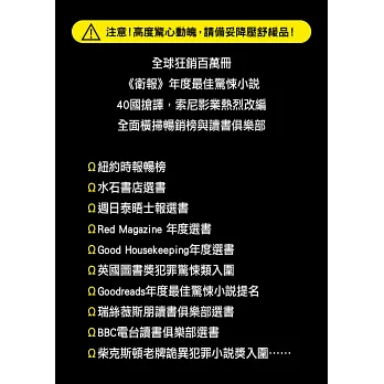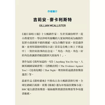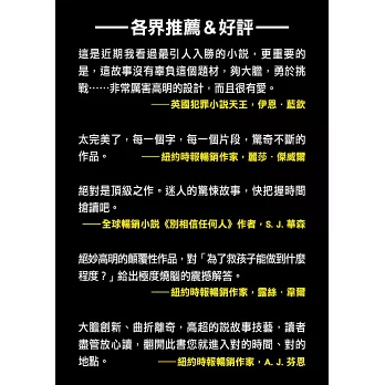 ◎ 絕對是頂級之作。迷人的驚悚故事,節奏無懈可擊,快把握時間搶讀吧。──全球暢銷小說《別相信任何人》作者,S. J. 華森