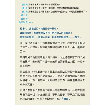 珍必須找到,不只為兒子,不只為了這場逆行謀殺的真相,更為了挽救他們一家的「明天」。
