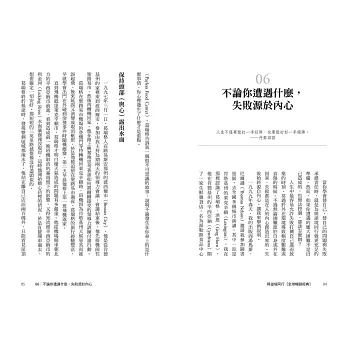 韓德爾在最困頓的時候創作出顛峰之作《彌賽亞》、暢銷推理小說家約翰.克雷西曾被退稿七百多次、詩人雪萊曾被學校退學……超過四十位名人背後成功的故事在在激勵我們,沒必要放棄,只要專注克服眼前難關,並朝下一個目標前進,終能獲得更高成就。