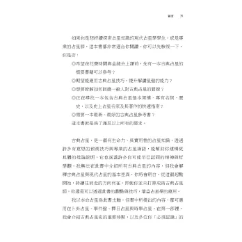 本書是奠定古典占星學重要觀念的入門書、極佳的指南。可以滿足讀者對古典占星學基本架構、專有名詞、歷史及史上占星名家與其重要著作的初步瞭解;也能符合理解古典技巧、提升解盤能力的期望,又可回應現代心理占星師對古典占星學的質疑。