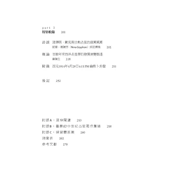 也正好因為市面上現代占星的出版品相當豐富,因此培育出大量的占星愛好者。這些占星愛好者,需要、也期待著更多、更好的占星學知識,繼續灌溉他們對於累積占星學知識的熱情。本書所提供的古典占星知識,正是時下許多占星出版品所缺乏,及未被重視的重要內容。相信本書不僅是提供占星愛好者及專業占星師開闢解盤技術的精進書,也絕對是業餘愛好者認識古典占星的知識入門書!