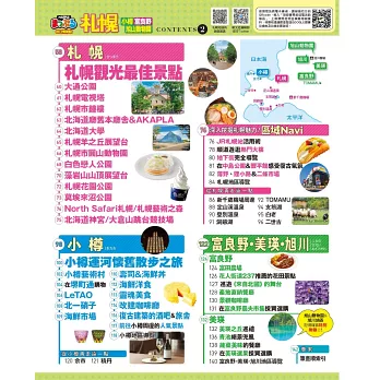 札幌是北海道最主要的城市,從台灣直飛約4小時,適合以此為據點,再將行程結合郊區的小樽、富良野或旭山動物園等地,既能盡情在市區內觀光、享受美食,也能欣賞深具北海道特色的魅力風情。哈日情報誌按地區分類,提供多種行程範例供讀者自行變化,詳列札幌市區經典景點、美味餐廳與必買伴手禮等豐富資訊,必定能讓旅行更加充實好玩!