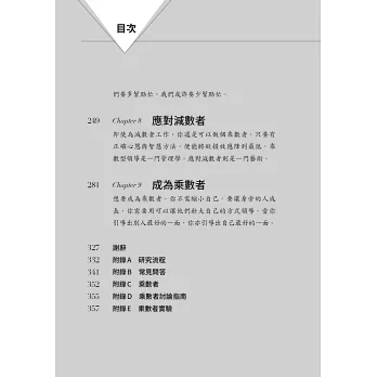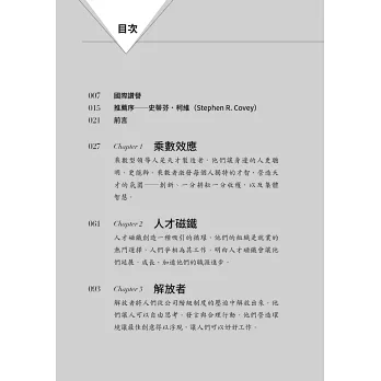 「我們都認識乘數者──他們能讓身邊每一個人展現最好的一面,而不是最糟的一面。他們是一間公司裡最棒的資源。如果你想學習如何成為乘數者,或是如何讓別人變成真正的乘數者,就要讀這本書。若你想提升自己的事業、壯大你的公司,就讀這本書。」──凱利.派特森(Kerry Patterson),暢銷作家,著有《不可不知的關鍵對話》(Crucial Conversations)