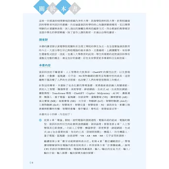 訪察國內多所大學院校之資電科系、理工科系教師意見,針對資訊科學教育編寫而成的書籍,內容兼顧深度與廣度,涵蓋資訊科學的核心知識與實務應用,並依據教學時數設計章節,讓學習過程順暢有序,同時將國家考試與研究所入學考試題型融合至內文、隨堂練習與學習評量,為學生將來升學與就業提早做準備。
