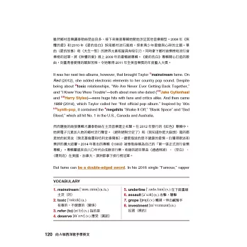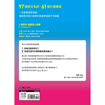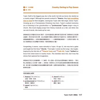 文章難易度為4000~7000字,符合大考英文閱讀測驗程度,針對文章中的91個英文名詞與相關歌手背景做解說。除此之外,全書提供61個片語的用法說明與使用範例,適合教學與自修使用。