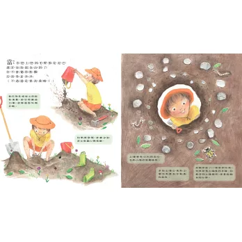 全書以清晰的文字搭配筆觸純真、層次繽紛的溫暖插畫,介紹了小動物、昆蟲、鳥類、植物的特性和棲息地,以及藏身在土壤中的小生命,讓孩子認識地面上和地底下的奧妙,並適時補充生物、地理、健康等相關知識,以自然且有趣的方式發展五感刺激、培養SDGs永續觀念,探索屬於自己的體驗與寶藏!