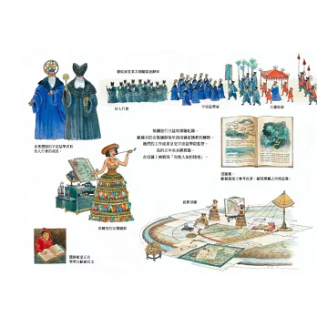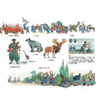 全書內容分為三冊,二十六個故事看似無涉,細看卻仍有所串聯,第一冊《A-I:從亞馬遜女戰士國到靛藍雙島》,從傳說中的亞馬遜,行至無人抵達的靛藍雙島,幅員跨越極地與沙漠、島嶼與大陸。我們能看見薩滿信仰過渡至文字記述的發展,也能看見人們從部落、小鎮出發,迎向航海冒險的新大陸探索,既令人驚奇,又感到些許能呼應現世的熟悉。