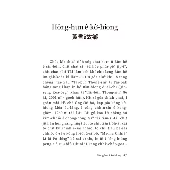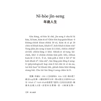 經過80冬ê年歲,生活ê滋味lú來lú kāu也lú甘,親像這个人生辦桌出菜,讚--ê留tī路尾。我teh想,敢一定tio̍h等7、80 冬,chiah ē-tàng出這款ê好味?按呢m̄是khah無彩?若是我kā chia-ê代誌寫--落-來,少年人讀--tio̍h,或者ē得tio̍h一寡有路用ê靈感。