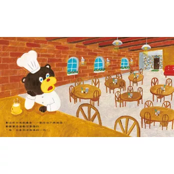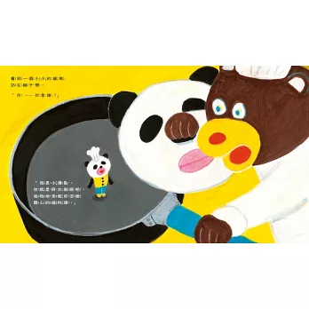 ⋯⋯生意清淡的大熊廚師,意外買到一個熊貓平底鍋,裡面有一隻小貓熊精靈(小湯匙),帶著大熊廚師唸咒語、開心做料理,做出好吃的料理,因而扭轉了幾乎要關門大吉的餐廳的命運,大熊廚師也找回做料理的快樂和自信。《貓熊平底鍋》除了跟〈小精靈與老鞋匠〉一樣,是一位匠人受到神奇力量幫助的故事,還安插了一個有趣的「禁忌」。而「禁忌」通常是拿來「打破」的。果真,在《貓熊平底鍋》中打破禁忌之後,所產生的畫面和大轉折,都令人驚喜。我不破梗,這段故事高潮,就請大小讀者自己親身體驗囉。