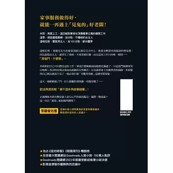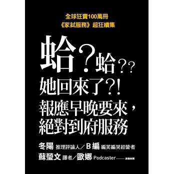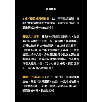 ※善良的米莉想走進體制內,從事夢寐以求的社工工作,但一次次的「家事服務」卻帶給她意料之外的際遇。豈止轉折又轉折,《家弒服務》第二集《家弒絕招》再進化,情節直逼九拐十八彎。身為懸疑推理小說迷的譯者邊翻譯邊讚嘆,每當自以為得到結論時,作者總會來個大甩尾。嘿,我甘心被耍好嗎,而且還開心、誠心且真心地佩服啊!──蘇瑩文/譯者