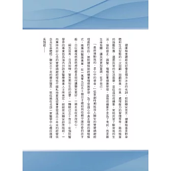 聯安健檢抓住台灣經濟飛躍發展過程中民眾對預防醫學健康檢查需求增加的趨勢脈動。以醫學中心的標準建置健康檢查診所,其中關鍵人物就是曾碧娟總經理30年來3個家的全心投入,值得讀者用「心」去閱讀。——洪子仁(新光醫院副院長/醫策會健康檢查品質認證召集人)