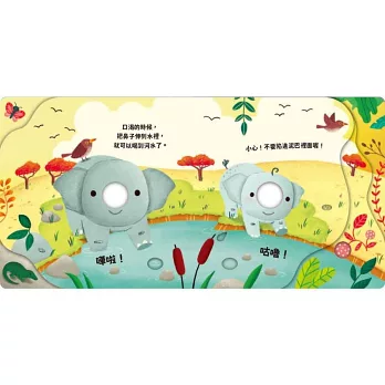 本書具有創意的設計理念,讀者可以將手指從書背的書洞穿過,隨著故事內容模仿大象鼻子擺動的樣貌。孩子能邊看故事邊動動手指,藉由操作激發靈感,也了解動物們的日常習性。