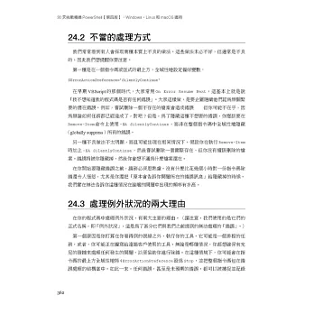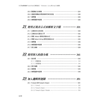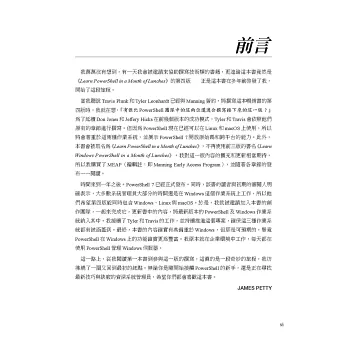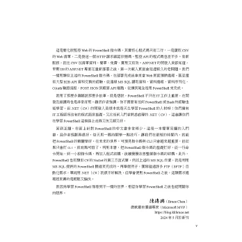 『市面上針對PowerShell 的中文書非常稀少,這是一本簡單易懂的入門書,且作者規劃得很好,每天用一點時間學一點技巧,讓我們在很短的時間內,就能把PowerShell的精髓學好。……我因為學習PowerShell而看到不一樣的世界,相信你學習PowerShell之後也能開闊你的眼界。』——微軟MVP 陳傳興(Bruce Chen)專文推薦