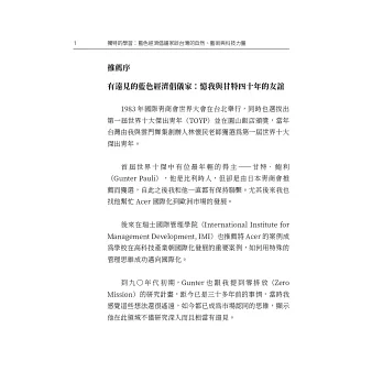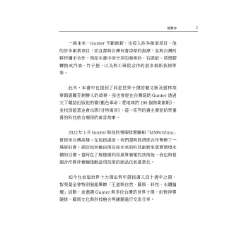 一路走來,Gunter不斷創新,也投入許多創業項目,他的許多創業項目,而且都與台灣有著深厚的淵源,並與台灣的夥伴攜手合作,例如本書中所分享的咖啡紗、石頭紙、將塑膠轉換成汽油、竹子屋,以及與工研院合作的很多創新技術等等。