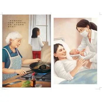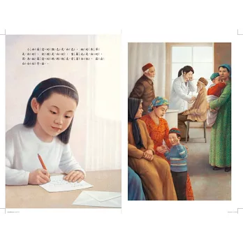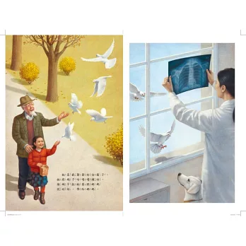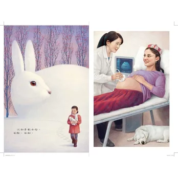 小白喜歡白色,她對白色情有獨鍾,這也象徵她對媽媽的愛和心心相連,小白的白窗簾、白毛衣,呼應媽媽的白袍;她喜歡白兔、白熊和白狗,小白抱著心愛的白熊娃娃,而白狗靜靜陪伴在認真工作的媽媽身邊……。本書透過左右跨頁的圖畫,分別描繪小白與媽媽在兩地的生活,母女間的甜蜜牽絆,更被深刻呈現:右頁圖畫以白色邊框包圍,那可能是媽媽實際在工作的情景,也可能是小白想像中的畫面。她和媽媽相隔兩地,卻不焦慮,她專心寫著給媽媽的信,相信媽媽正用心的工作,替病人看病;她喜歡看白白的月亮,因為她知道媽媽也喜歡、她和媽媽看到的是同一個又大又圓的月亮;她對鴿子說話,那些要給媽媽的話,彷彿鴿子都能替她傳達;當家裡貼起春聯,她就知道媽媽要回來和她一起吃餃子了。