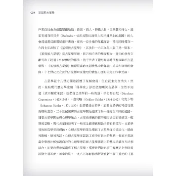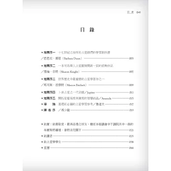 2.本書於十七世紀出版,是史上第一本有架構完整、解說詳細的占星工具書,對於占星入門者及占星研究者來說,內容的全面性和豐富性,是學習占星必備研讀的第一本書!