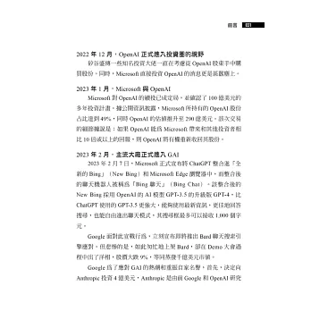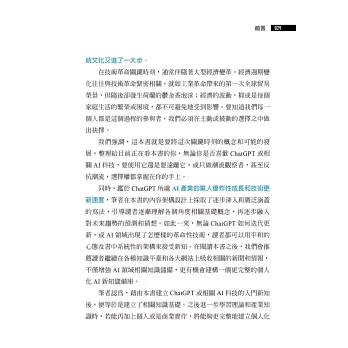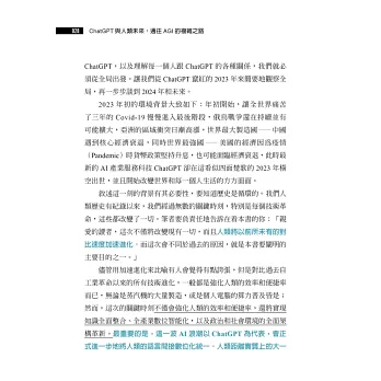 寫書是一段相當個人的旅程。除與另一位作者和出版社的互動之外,在寫書時的深思研究和修改的反饋,和國際、國內最前線的優秀AI團隊及大型投資機構的互動、對談,以及在邀序的所有過程都是這次旅程最大的收穫。每當夜半修稿,專程參加各種相關的線上和實體會議,分析和蒐集最新資訊的時候,都會想到最早促成自己要完成這本書的初心,只是簡單地希望我周遭的人能理解GAI已經改變了世界,甚至能一瞥將至的未來。若有幸讀者能藉此書的觀點和拙見帶來想法的改變,甚至進一步地改變部分生活,這也將會是我最大的幸運。